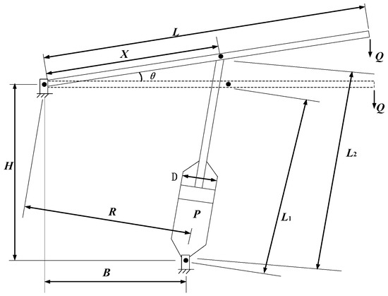 where Q = 10,000 lbs, θ = 45°, L = 240 in, oil pressure P take 1500 psi and maximum allowable bending moment of lever Mmax = 1.8 × 106 lbs in.