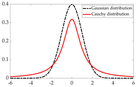 At present, the commonly used variations in meta-heuristic algorithms are the Gaussian variation and the Cauchy variation [50,51]. The comparison between the Gaussian distribution and the Cauchy distribution is shown in Figure 1. As shown in Figure 1, the graph of the Cauchy distribution has a relatively small peak value near the origin. After the mutation of the HHO, the search for the global optimal value will be increased, and the search time for the adjacent local interval will be reduced. MEHHO’s search ability for the global optimal value has been significantly improved, and the global exploration ability and local mining ability of the algorithm can be better balanced. In addition, compared with the Gaussian distribution, the two wings of the Cauchy distribution are flatter and wider, and the closer they are to the horizontal axis in the horizontal direction, the slower they fall. From the perspective of probability, the Cauchy distribution has a wider distribution range and allows a larger runout variation, which is more suitable for improving the global exploration ability of the algorithm. Therefore, the Cauchy mutation is selected in this paper to generate more diverse population individuals to search the main search space, so that HHO can quickly jump out of the local optimal value points.