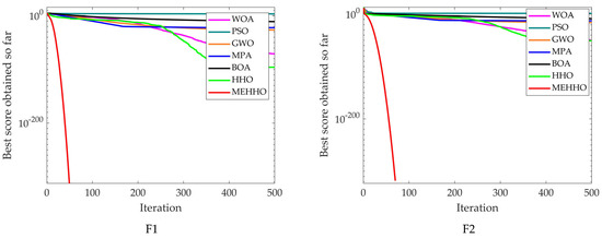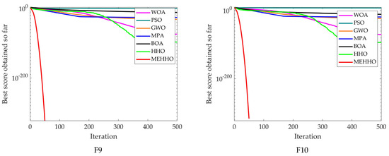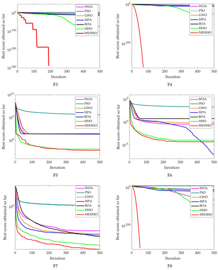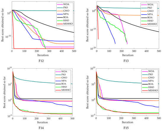 To verify the effectiveness and significance of MEHHO, six meta-heuristic algorithms are selected for comparison in this section. They are Harris Hawks Optimization (HHO, 2019) [34], Whale Optimization Algorithm (WOA, 2016) [9], Marine Predators Algorithm (MPA, 2020) [12], Grey Wolf Optimizer (GWO, 2014) [56], Particle Swarm Optimization (PSO, 1995) [6], Butterfly Optimization Algorithm (BOA, 2019) [11]. To ensure the objectivity of the results, the same parameters are set for each algorithm: the population size is all 30, the maximum number of iterations is 500, and the dimension of the test functions F1–F20 is 30. After each test function is run 30 times independently, its mean value, standard deviation, and computing time (unit: s) for each algorithm to reach their respective optimal value in Table 4, Table 5 and Table 6 are calculated. The experimental results are shown in Table 4, Table 5 and Table 6, where the bold fonts indicate better optimization results. To directly show the optimization performance of the MEHHO, the convergence curves of some benchmark test functions of the seven algorithms (F1–F9, F11–F19, F26–F28) are listed in this paper, as shown in Figure 3, Figure 4 and Figure 5.