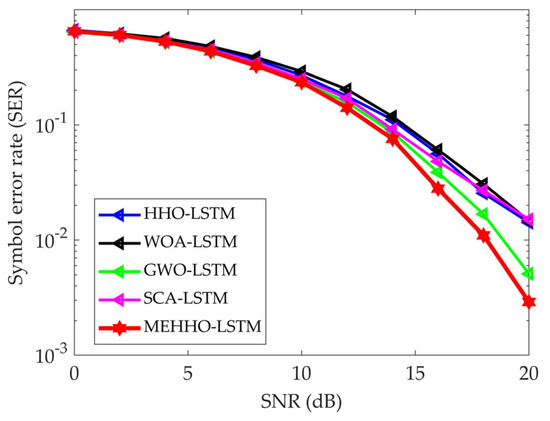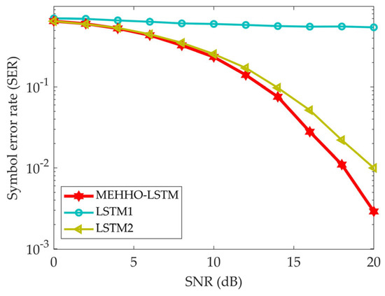 Firstly, the MEHHO-LSTM network is compared with LSTM1 and LSTM2 networks in channel estimation and signal detection performance. As can be seen from Figure 7, the performance of the LSTM1 network is the worst and cannot effectively reduce the SER, while the LSTM2 network is far superior to the LSTM1 network, indicating that the selection of key initialization parameters has a great impact on the network estimation and detection performance. When the signal-to-noise ratio (SNR) is greater than 10 dB, the MEHHO-LSTM method is better than LSTM2. When the SER is , the performance is improved by 2−3 dB. The results show that the proposed algorithm can effectively optimize the key initial parameters of the LSTM network, to improve the accuracy of channel estimation and signal detection, and overcome the shortcomings of manually selecting the initial parameters of the LSTM network.