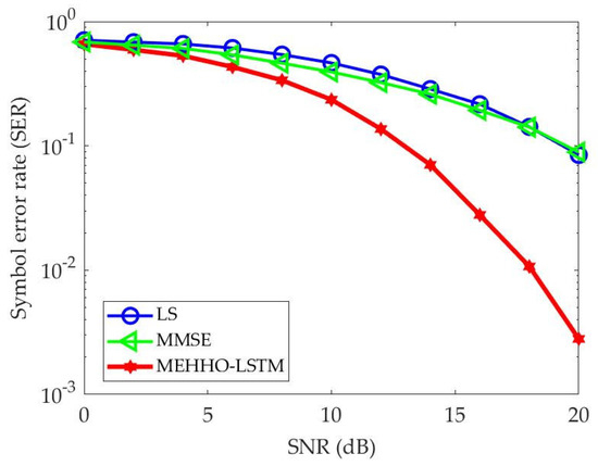 Figure 9 shows the comparison curve of the SER performance of the proposed MEHHO-LSTM algorithm, least squares (LS) algorithm, and minimum mean-square error (MMSE) algorithm with the change of SNR. It can be seen from the figure that the scheme using MEHHO-LSTM has the best performance, while the traditional LS and MMSE methods have a very slow rate of SER decline. When the SNR of the proposed model is greater than 10 dB, the rate of SER decline increases significantly. When the SER is , the performance of the proposed algorithm is improved by 6–7 dB compared with the traditional LS and MMSE methods. This is because the traditional methods rely heavily on the number of pilots, but the MEHHO-LSTM proposed in this paper is robust to the number of pilots used for channel estimation. It can be shown that the MEHHO-LSTM network model, compared with traditional methods, can significantly reduce the SER of the OFDM system transmission signal, and has good channel estimation and signal detection performance.