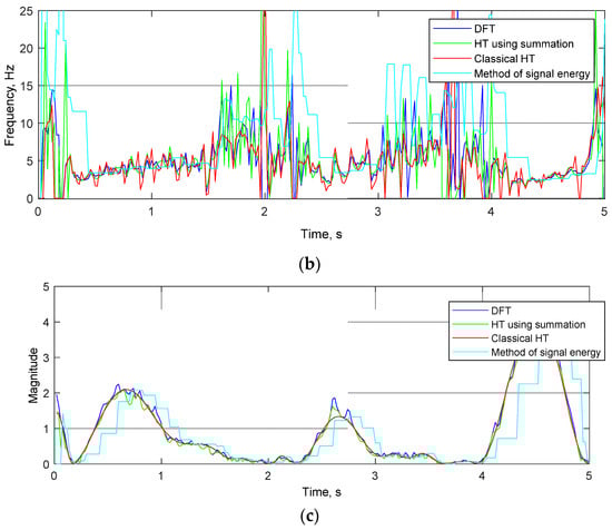 The results of mode component calculation for each method: (a) initial signal; (b) signal frequencies; (c) signal magnitudes.