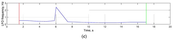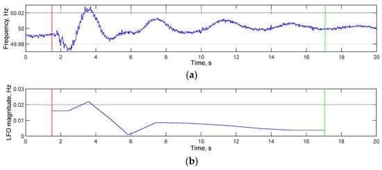 The interval of LFO occurrence is estimated based on exceeding the irregular component of a signal by the amplitude value. The irregular component of a signal (sum of random insignificant changes in a process and measurement errors) is estimated to be equal to three standard deviations (SD) of the initial data on the initial interval starting from the curve that approximates the data on this very interval by a third-degree polynomial. The distribution of the irregular component is assumed to be close to a normal distribution. Assuming that the irregular component is distributed normally, then oscillations take place on those intervals where the amplitude exceeds three SD of the initial data. The results of the method application are shown in Figure 5, including the set of intervals of LFO occurrence (inception shown as a red line, end shown as a green line) and estimates of the amplitude and frequency.