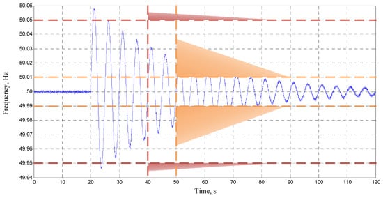 The evaluation of LFO threat in power systems should be based on the analysis of LFO parameter changes and the facts of the violation of set limits and the acceptable duration of such events. Acceptable limits and duration values are set using expert recommendations based on PMU data analysis and they can be further corrected using data from real practical experience. The acceptable duration of exceeding the limit by an LFO parameter is found depending on the amplitude and frequency of the LFO. The default values of indices are shown in Table 2. Values of the duration exceeding the limit by an LFO parameter are to be set for each type of LFO [56]. The graphical interpretation of LFO threat criteria and limit values are shown in Figure 6: «Alarm» level is marked by orange lines (horizontal lines indicate a criterion value, vertical lines indicated duration of exceeding the limit) and hatching, while «Danger» is marked by red lines. Figure 6 shows a real frequency signal recorded during a technical incident at one of the large power plants with the highest frequency fluctuation value of 0.108 Hz.