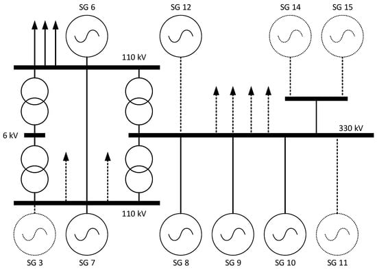 According to the single-line diagram of the power plant, generators 8–10 operate at one bus of rated voltage 330 kV (tie circuit breaker is switched on), and generators 6 and 7 are separated from the others by autotransformers at 330/110 kV, respectively. All power units have the same transformers. All generators have the same equipment, including the exciter and AVR. It should be noted that regulator settings were set separately in order to create the possibility of a situation when settings may vary during the disturbance.