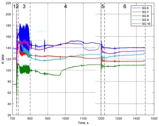 These oscillations were not caused by the disturbance; it is for this reason that their analysis is of great importance. The active power output of the generators has been dropping insignificantly during the LFO: the power drop for generator 6 was about 15 MW, the power drop for generators 7 and 8 was about 10 MW, the power drop for generator 9 was about 25 MW, and the power drop for generator 10 was less than 10 MW.