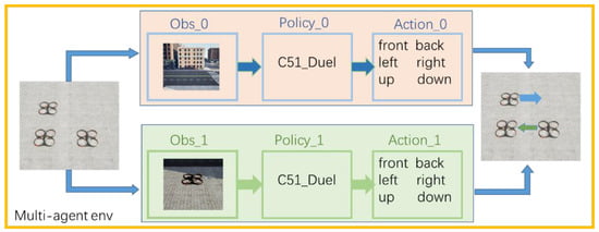Common obstacle avoidance algorithms based on visual perception often rely on RGB and depth images. UAVs can use RGB images to identify the objects and depth images to estimate obstacles or other UAV positions. However, the UAV, in reality, rarely uses multiple-depth cameras due to the limited image-processing ability. Therefore, we only use the RGB images from the first-person perspective in our experiment, making the experiment closer to reality. The front UAV cannot observe the back, and the back UAV must respond in real-time according to the movement of the front UAV. We set the observation shape of multiple UAV scenarios as an 84 × 84 × 3 matrix, denoted as Box (84, 84, 3) in gym style, as shown in Figure 3.