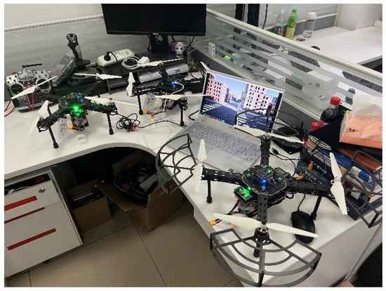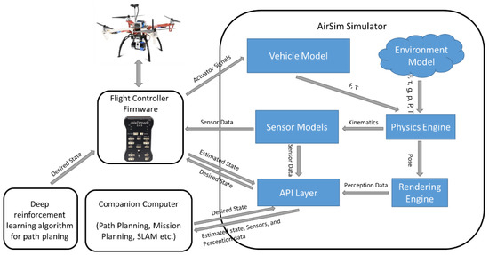 We used the simple-flight mode developed by AirSim for training. Simple-flight is a method to simulate the hardware control of PX4 using the software. It integrates several tools to facilitate simulation, making it ideal for the training phase. When the training is completed, and the training weights are saved, the simulation environment is connected to the real hardware to make the algorithm run on the real microcontroller. We use a Pixhawk PX2.4.8 as the UAV autopilot. PX4 communicates with AirSim via MAVLink protocol. The UAV information in AirSim contains the sensor information and control model. AirSim simulates the sensor status of the real UAV flight, such as IMU, and GPS, and sends them to PX4. PX4 performs attitude estimation and dynamic solutions and then sends control information to Airsim. The HITL architecture of AirSim is shown in Figure 9. The configuration of the evaluation UAV path-planning algorithm is shown in Figure 10.