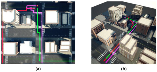 To verify the effectiveness of the proposed algorithm in a complex 3D environment, we designed an urban environment using Airsim, as shown in Figure 4. The environment is about 40,000 m2, including several tall buildings, villas, and other constructions, and there are also roads and narrow gaps between the buildings. The urban environment model is available on the UE Marketplace. The target moves repeatedly within the green area, and the speed is 0.8 m/s. During the experiment, we assumed that the UAV could not fly over the roof of tall buildings, and there is no communication between the UAV and the ground station or among UAVs. Therefore, it is necessary to ensure that each UAV has independent perception and decision-making ability rather than using a central console.