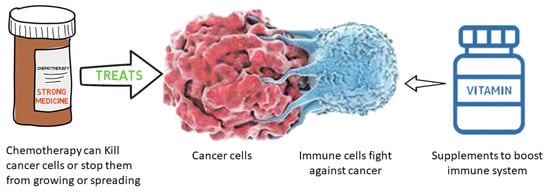 Numerous epidemiological studies have demonstrated the link between elevated cancer death rates and environmental changes in diet, pollution, lifestyle, and other variables. [15,16,17,18]. The relationship between a healthy diet, vitamin group, and the strengthening of the immune system has been under the microscope recently. It has been demonstrated that vitamins play an essential part in the regulation of the activity of the immune system, which is necessary for the protection of tissues from damage [17,19,20,21]. Ku-Carrillo developed an obesity–tumor model that has highlighted the role played by obesity in the tumor’s resistance to chemotherapy [22]. Rambely and his collaborator created a healthy immune system model that dynamically depicts how the immune system inhibits the progression of aberrant cells into tumors to contrast the analytical results of an unhealthy immune system model [23]. The numerical simulation of the model in [24] reveals that the immune system can be strengthened when an individual consistently consumes vitamins, at a daily rate of 16%, as a result of their effect on the body’s response to the formation of aberrant cells in the tissue.