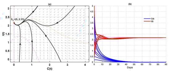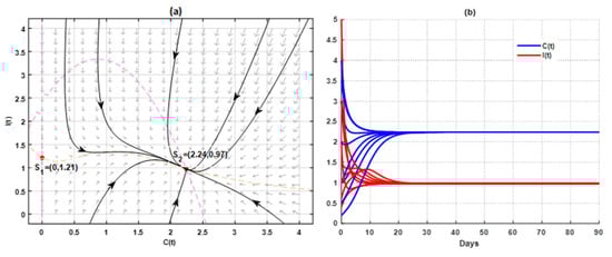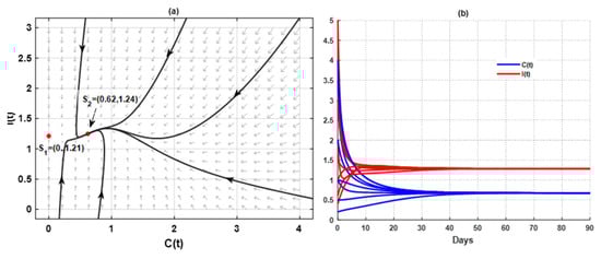 Numerical simulations of the CICV model for the data given in Table 1. (a) Phase portrait of the CICV model. (b) Time series of the CICV model.
