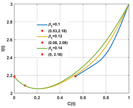 Finally, the impact of altering the number of chemotherapy doses is determined in Figure 7. It is clear that the trajectory of the CICV model settles down asymptotically to the interaction state for . On the other hand, the system loses persistence and approaches the tumor-free state for . Therefore, shows the lowest dose of chemotherapy required to reach a cancer-free state.
