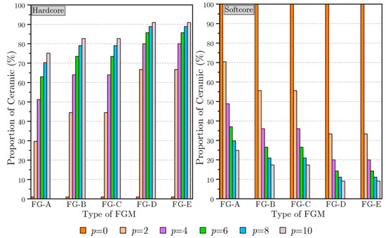 To understand more about the combination of the gradient materials that was related to the inhomogeneity parameters p, k, and e, Figure 4 was plotted to present the ceramic constituent proportion (%) in the various coated FG structures. This will help to explain the response of the mechanical nanoshells in the next analysis.
