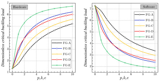 Dimensionless critical buckling load of FG shells for various material exponents p, k, and e.