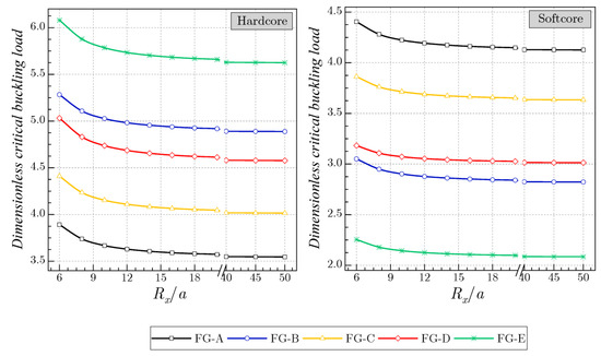 The impact of the radius of curvature ratio () and various coating schemes on the buckling response of the hard core or soft core coated shells is plotted in Figure 6. It should be noted that an increase in the radius of curvature necessarily meant that the shell gradually lost its curvature until the shell became a plate (. As shown in Figure 6, the values of the critical buckling loads were reduced by the increase in the radius of curvature for both the hard core and soft core shells. The effect of the ratio was neglected for values more than 18.