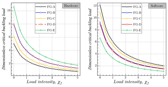 The impact of the intensity of the axially applied load on the dimensionless critical buckling load of the coated FG shells is presented in Figure 8. It can be seen that for all of the coated shell types, the increase in the intensity of the applied loads led to a decrease in the critical buckling load.