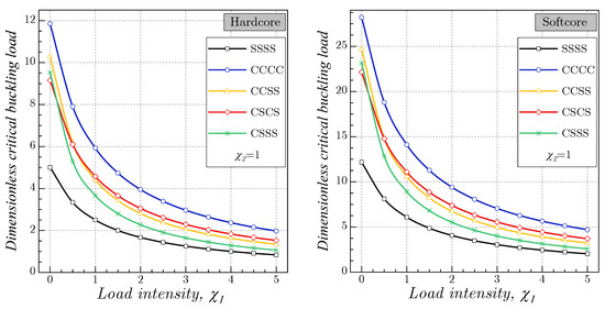 The same analysis is presented in Figure 15, but this time the effect of the aspect ratio was replaced with the axial load intensity . It is worth mentioning that the critical buckling loads increased with the increase in the orthotropic elastic foundation parameters and in a linear manner. In addition, the axial load intensity had an important impact where the critical buckling loads decreased due to the augmentation of .