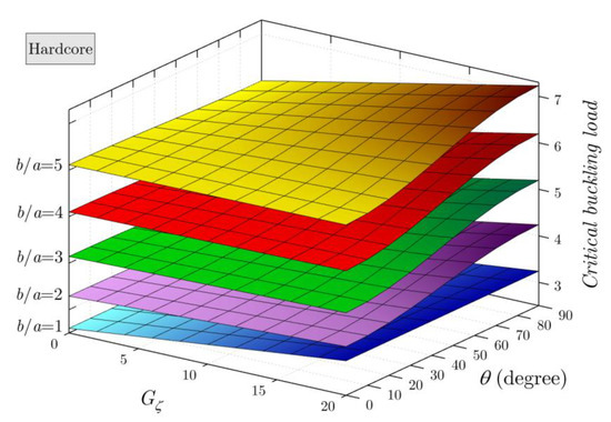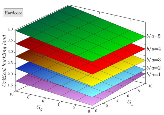 In Figure 7, the action of the side-to-thickness “a/h” and aspect “b/a” ratios on the buckling loads of various patterns of simply supported soft core coated FG shells is plotted. It is clear that the increase in both the aspect “b/a” and side-to-thickness “a/h” ratios increased the dimensionless critical loads.