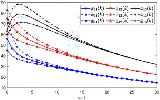 Figure 3, Figure 4 and Figure 5 show the simulations and state estimations of three agents, respectively. It can be seen that the designed observer (3) provides precise estimations of the states of system (2). On the other hand, all the evolution of the real states are kept nonnegative and always between the estimated states and . The simulation results of the estimate errors and of the ith agent are shown in Figure 6, Figure 7 and Figure 8, respectively. It is obvious that all the estimate errors converge asymptotically to zero, which means that the observer (3) gives effective estimates.