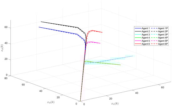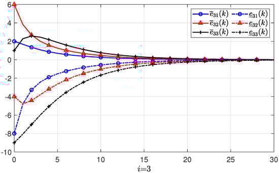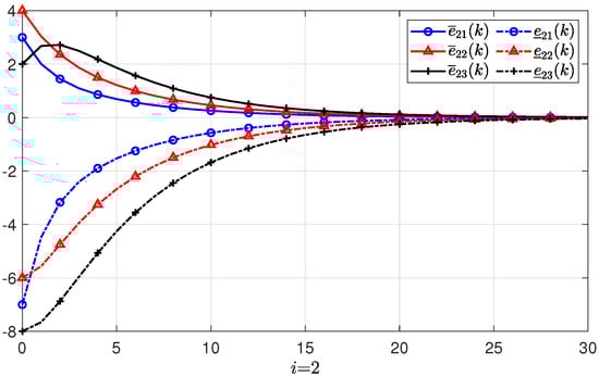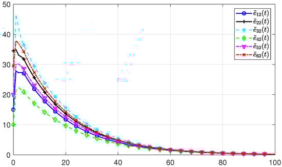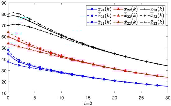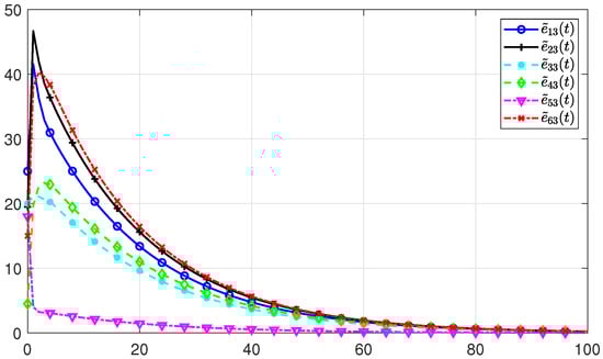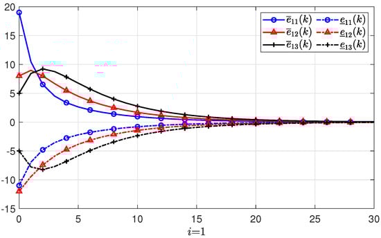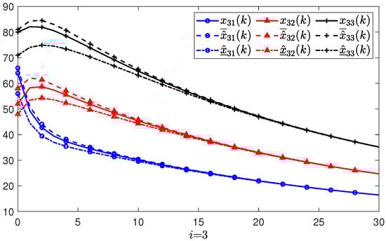 Suppose there are three agents in the PMASs, and the initial states, initial upper state estimates, and initial lower state estimates of each agent are given as: , , , , , , , , , respectively. The estimate errors with regard to the lower and upper initial estimates are denoted by and , respectively. Based the feasible solutions of the conditions in Theorem 1, the gain matrix of the positive state observer can be obtained as