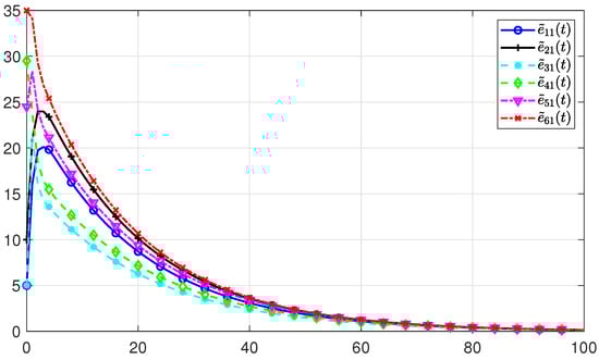 Give the initial states and initial estimated states of all the agents as: , , , , , , , , , , , . Choose . By solving the conditions presented in Theorem 2, the gain matrices E and L of observer (8) are