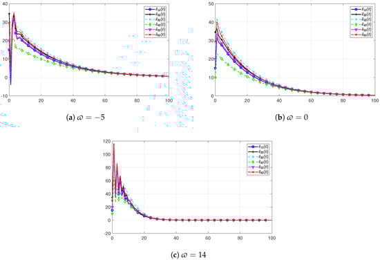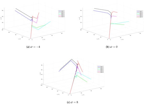 It is well known that the potential noise may be amplified by the derivative component on PID controllers. To survey the sensibility of the designed PID protocol on the derivative component, a gain disturbance has been added, which is denoted by . Thus, the gain matrix of the derivative component can be given as . For clarity, we define that all entries of are ϖ. Figure 14 illustrates the state trajectory of all the agents with different disturbances of component D. It can be seen that after the disturbance is added, the system fluctuates and takes more time to reach an agreement. Figure 15 shows the simulation of the estimation error of the second component of each agent state. It reveals that when the disturbance exceeds a certain bound, negative estimation error occurs. It means that the positivity of the closed-loop system (11) cannot be guaranteed.
