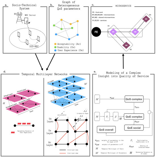 Bringing complexity to 6G to assess the quality of microservices. The figure schematically describes the main aspects of our proposed modeling approach. We consider a socio-technical system of mobile users and devices (a) exploiting a D2D-MEC system for communication and computing of tasks. We assume that a set of services accessed by end users, as in (a), is represented as a set of microservice applications which consists of multiple composite services (c). We consider a graph of heterogenous networked QoS parameters (b), belonging to different categories (Ac, Us, Ue). In (d), we show the temporal multilayer representation for both environments. The analysis of both complex structures, their interdependence and dynamics leads to the complex systems of QoS and QoE, whose algorithm is detailed in the scheme in (e).