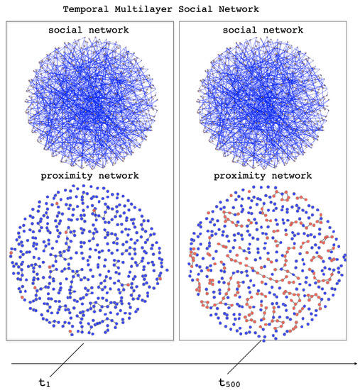 Spreading dynamics of user experience in the temporal multilayer social network. The plot displays the spreading of user experience within the network , showing the time steps selected in T. The network is composed of a virtual social network layer (the two graphs in the upper portion) and a proximity network layer (the two graphs on the lower side). The red circles represent the infected nodes, the blue circles the susceptible nodes.