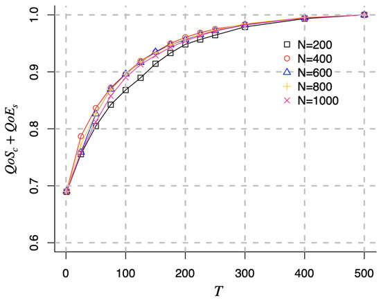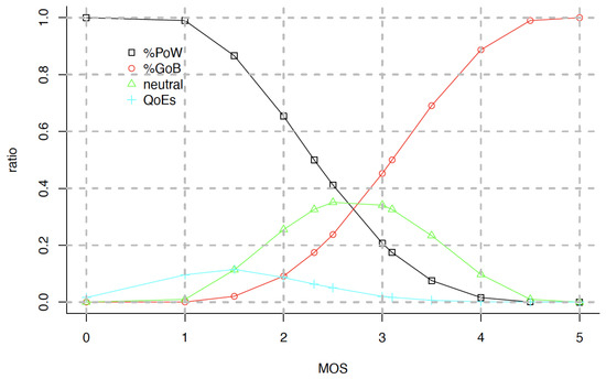 The simulations conducted were based on the proposed modeling approach described in Section 4, leading to the following results. The selected findings were properly chosen to extract the most relevant findings. As explained in previous sections, we designed a temporal multilayer social network with two types of topologies, the scale-free network (SF) [81] for the social-network layer topology and a TERGM dynamic proximity network with random edge formation and dissolution effects [86] for the proximity network layer. In Figure 2, we display the temporal multilayer social network , the evolutionary structure and the spreading dynamics, in the selected time steps within the overall temporal window of observation T. The lower side of the figure shows the time-varying proximity layer of interactions between nodes, differently from the upper portion, which shows the topology of the scale-free network hypothesis, as specified in Section 4.1. The virtual layer does not vary in , by displaying the same topology of a scale-free network in the overall observation period, differently from the real proximity network. According to Equation (4), the higher the mean value of participation in , the higher is the probability of infections emerging from the time-varying proximity and proportional to the , assumed to be a computed value the users are aware of. In Figure 3, we show the evolution of the overall complex QoS dynamics in T, by varying the population size N of the temporal multilayer social network . The overall complex QoS is the sum of two contributions, the and , respectively, expressed in Equations (2) and (5). The resulting overall value increases as a function of the quality system mined from in conjunction with the dynamics of the , which follows the spreading dynamics of the user experience during T, in . The overall value of QoS changes slightly in the temporal window T under the increase in the population size N, due to the aim of being scale-free for the virtual layer, which is a highly heterogeneous network, characterized by a power-law degree distribution with very few hubs in the network. This implies that, regardless of N size, the hubs in a heterogeneous network produce the same acquisition of experience over time. In Figure 4, we display the variation in the complex QoS as a function of the number of the parameters J, the population size of the temporal multilayer quality network , under network structures exhibiting a different level of heterogeneity, the scale-free (SF) network [81] and the small-world (SW) network [87], for both the intra-layer and the inter-layer interactions, which determine the co-adoption. SW networks are characterised by high clustering and modularity with an over-abundance of hubs which mediate the shortest path length, and, in terms of quality, co-adoption so distributed would entail high costs. SF networks, which are highly heterogeneous networks, are characterised by a high degree of correlation between nodes and degree distribution, which means that there are few hubs in the network. We find that the increase in the number of parameters J, whatever role they may play in the network , has a greater impact on if their co-adoption follows a small-world pattern, while it remains slightly invariant if we consider a scale-free one. The extra information on quality obtained from the complex structure is more variable as the number of high-degree nodes (hubs) is introduced, and the abundance of hub nodes results in more co-adoptions and, thus, higher computational costs. In Figure 5, we illustrate the variation in the infection rate , characterizing the spreading dynamics of the user experience in the temporal multilayer social network, as a function of the mean value of the participation coefficient , computed as in [61]. This trend is displayed against the number of attributes J of the temporal multilayer quality network, as in Figure 5a, while in Figure 5b, we show vs by fixing and varying the network topology for co-adoption in . We figure out how an increase in the average participation in the social network results in an increase in infection rate and whatever the number of attributes, the strong hierarchical difference in the scale-free hypothesis for co-adoption allows for the same growth trend. Differently, in Figure 5b, the introduction of the small-world hypothesis and with a fixed number of J, includes more co-adoptions between nodes than the scale-free case and with a less heterogeneous degree of distribution. This results in a faster rate of growth with lower participation values. Figure 6 shows the relationship between the MOS, %PoW, %GoB as used in the E-model [88]. It is a well-established practice to use the mean opinion square (MOS) to asses the perceived QoE, as with the usage of the percentage of poor-or-worse (%PoW) and good-or-better (%GoB) [89,90]. We compared these measures with the probability density function of the distribution of values, as in Equation (5), referring to users not rating in terms of poor or worse as well as good or better or neutral, but as a result of the spreading dynamics of user experience in the temporal multilayer social network. Around the mean value of the , computed for , the span of is more flattened because it is the result of the spreading dynamics of the perceived experience in the social population, under the heterogeneous assumption of being scale-free, over time.