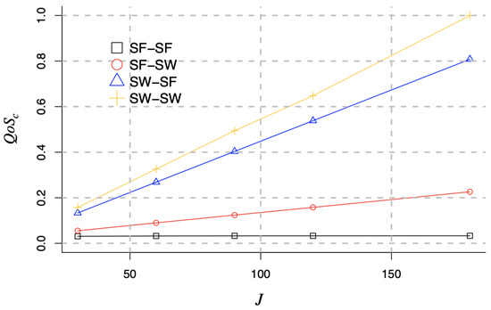 Complex QoS in function of population size and network-topology hypothesis of the temporal multilayer quality network. We shed light on the complex QoS in function of the J numbers of parameters, and population of . We took into consideration different network topology hypotheses for the co-adoption in . We explore four cases, choosing scale-free (SF) or small-world networks (SW). In each case, the first topology indicates the intra-layer scheme, while the second one indicates the inter-layer scheme.