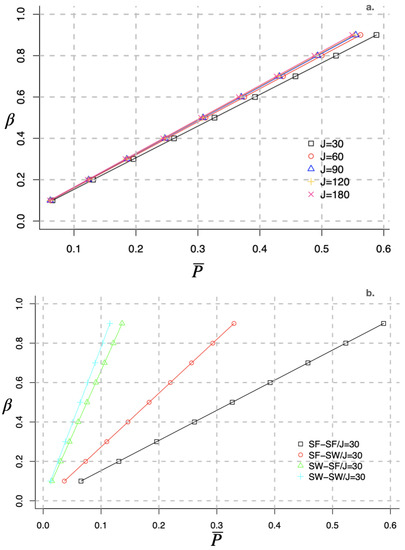 Participation coefficient vs. infection rate, under the number of quality parameters. We show in (a) the infection rate as function of the mean value of the participation coefficient in , against the J parameters in , taking into consideration a network topology hypothesis for the co-adoption that follows the scheme SF-SF. In (b), by fixing the , we vary the network hypothesis, by including also the small-world network.