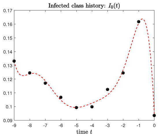Best−fit polynomial for the nodal values of infected density in the lag period. Red dashed line: plot of history function in the whole sample period . Black bullets: nodal values which are measured for infected density, they are obtained by relating the entries of the vector to the initial number of companies operating at .
