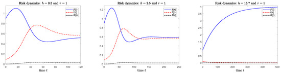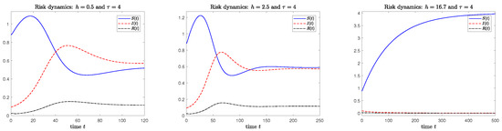 We would like to make a brief final remark about the behaviour of recovered density over the long term. Under the assumption that an equilibrium is stable and attracts the trajectories that solve the system, i.e., and as , then it is easy to verify that is convergent toward . In other words, by applying the classical theory of real function limit, we obtain that as . As expected when the endemic equilibrium is feasible and stable, this last result implies that the magnitude of recovered companies tends to which increases when the financial immunity period τ becomes longer. On the other hand, as expected in the case when the risk-free equilibrium attracts the solution trajectory, the recovered density decays and the recovery pool becomes empty in the long run.