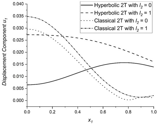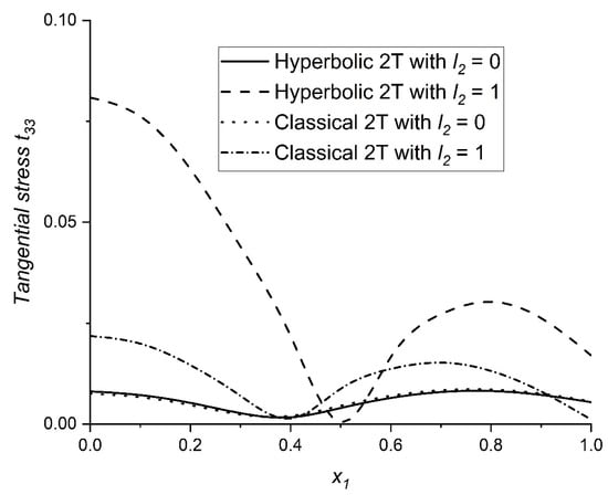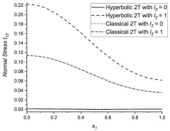 The graphs are plotted for t = 0.15. The values of the displacement component , displacement component , thermodynamic temperature T, normal stress , conducive temperature tangential stress , and coupled stress for nMCST and H2T due to inclined load.