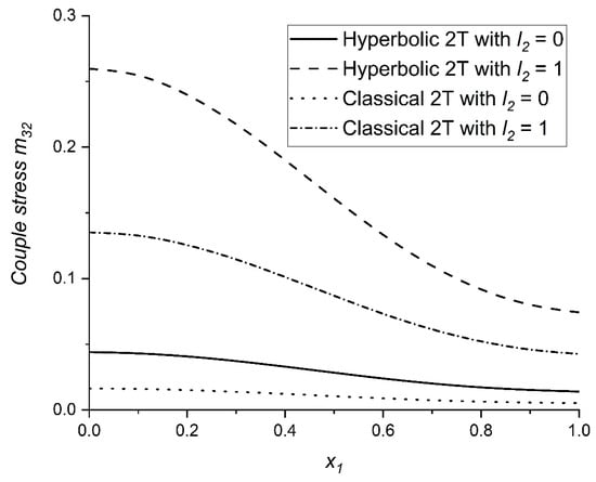 Figure 7 displays the deviations of Normal Stress using nMCST for H2T and C2T with different values of length scale parameter . In the initial value of , the increases slowly for H2T and C2T for length scale parameter and decreases sharply for H2T and C2T for length scale parameter . H2T with length scale parameter shows a higher variation in the as compared to C2T. Figure 8 displays the deviations of tangential Stress using nMCST for H2T and C2T with different values of length scale parameter . In the initial value of , the decreases sharply and then shows a slight rise for the rest of the value of . H2T shows a higher variation in the as compared to C2T. Figure 9 displays the deviations of couple stress using nMCST for H2T and C2T with different values of length scale parameter . For H2T and C2T, the for length scale parameter decreases sharply. H2T shows a higher variation in the as compared to C2T with length scale parameter.