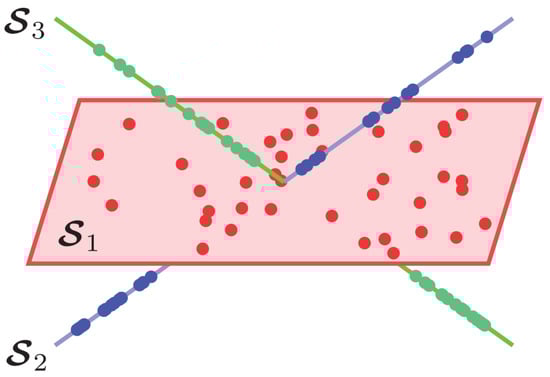 With the rapid development of information technology and the advent of the big data era, data have shown explosive growth and presents complex characteristics such as high dimensionality, nonlinearity, and incompleteness. Although traditional clustering methods have achieved excellent results in low-dimensional data mining tasks, they often encounter serious bottlenecks in high-dimensional data mining tasks, which cannot meet the sparsity of high-dimensional data and avoid the impact of the “curse of dimensionality” [20,21]. Since the inherent characteristics of high-dimensional data, it usually lies in a union of low-dimensional structures instead of being uniformly distributed across the whole space. For instance, Figure 1 shows a set of sample points in from a two-dimensional subspace (the plane ) and two one-dimensional subspaces (the lines and ). It is worth pointing out that it is difficult to analyze the data as a whole, while the natural properties of this data can be better reflected in its underlying low-dimensional subspaces (plane or line). In fact, in many practical problems, the data in each class can be well represented by low-dimensional subspaces. For example, the face images of a person under different lighting conditions can be distributed in a nine-dimensional subspace [22,23], and the motion trajectories of rigidly moving objects in a video belong to different subspaces whose dimensions do not exceed three [22]. To explore high-dimensional data in a low-dimensional space, subspace clustering arises at the opportune time [24]. The subspace clustering aims to search for the underlying subspaces in dimension space or data space to obtain corresponding subspaces and clustering results. Over the past several decades, subspace clustering has been widely used in face recognition [25,26,27], motion segmentation [28,29,30], image processing [31,32,33], speech emotion recognition [34,35], social network [36,37], and other fields.