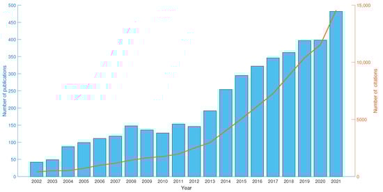 Due to the advantages of SC, a number of SC methods have been proposed during the past decades. Figure 2 shows the development trend of SC publications and their citations over the past two decades. It can be seen that SC shows a growth trend in general, and the growth trend has dramatically increased since 2013. According to their mechanisms of representing the subspaces, the existing SC methods can be roughly divided into four main categories: algebraic methods, iterative methods, statistical methods, and spectral clustering-based methods. These four categories of SC methods are briefly discussed below (see [39] for details). Algebraic methods include matrix factorization-based methods [40,41] and generalized principal component analysis (GPCA) [42,43], but algebraic methods are usually highly sensitive to noise and outliers, and the complexity of GPCA increases exponentially with the number and dimensions of subspaces. Iterative methods, such as k-subspaces [44,45,46], alternatively assign the data points to subspaces and fit the subspaces to the corresponding cluster. However, iterative methods usually need to know the number of subspaces and the dimensions of subspaces in advance and are sensitive to the initial point. Statistical methods can be regarded as the probabilistic description based on iterative methods, including probabilistic PCA (PPCA) [47,48], mixture of probabilistic PCA (MPPCA) [47,49], random sample consensus (RANSAC) [50,51], etc. Unfortunately, statistical methods usually require that the dimensions of subspaces are known and equal, and their complexity increases with the number of subspaces. Most recently, spectral clustering-based methods have played a dominant role in SC problems due to their easy implementation and insensitivity to data corruptions and initial points. In the following, we will focus on spectral clustering-based methods.