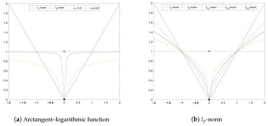 Although the pseudo norm regularization has been widely regarded as the origin model of sparsity and achieved superior clustering performance, its computational cost is expensive, and the convergence of algorithm is hardly guaranteed. A better strategy is to use some nonconvex functions to approximate pseudo norm, such as arctangent–logarithmic function [57] and -norm [58]. Dong et al. [57] proposed a sparse subspace clustering via the nonconvex approximation (SSCNA). Specifically, SSCNA used the arctangent–logarithmic function with to approximate the -norm. It has proved that the proposed nonconvex approximation is closer to -norm than the -norm and is bounded by pseudo norm (see Figure 6). Dong et al. [58] formulated the sparse subspace clustering as a smoothed minimization problem (SSC-SLp). It is worth pointing out that the -norm can better approximate the pseudo norm than the norm (see Figure 6). In addition, an effective algorithm with convergence was established based on ADMM.
