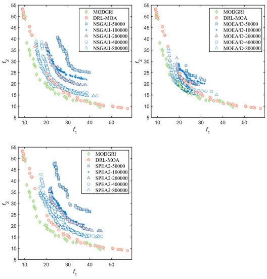In order to provide fair comparisons, the same experimental settings as in [7] were set for the selected evolutionary algorithms, which were terminated at 500, 1000, 2000, and 4000 iterations, and are equivalent to 50,000, 100,000, 200,000, and 400,000 fitness evaluations, respectively. Experiments of NSGA-II, MOEA/D and SPEA2 running with 800,000 fitness evaluations were also added, to observe whether doubling the fitness evaluations to 800,000 made the algorithms perform better or worse than MODGRL and DRL-MOA. Such extra experiments were performed to express the importance of algorithm comparisons under fair conditions, no matter if these algorithms are within the same or different categories.