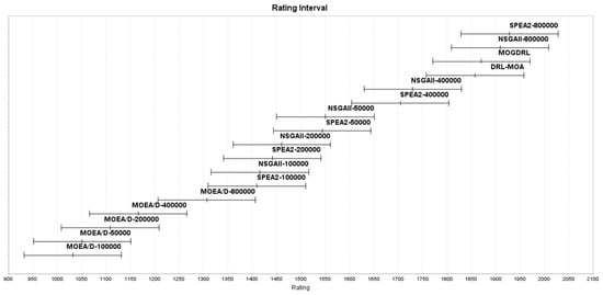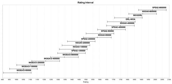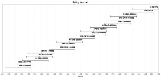 In order to replicate the experimental setting of [7], this paper selected DRL-MOA and two evolutionary algorithms (i.e., NSGA-II and MOEA/D) from [7] to compare with MODGRL. Additionally, SPEA2 was selected so that there were sufficient algorithms to conduct statistical analysis and rankings by CRS4EAs, “a novel method for comparing evolutionary algorithms, which evaluates and ranks algorithms regarding the formula from the Glicko-2 chess rating system [40]”. CRS4EAs [40,41] is capable of conducting non-parametric statistical tests [42]. An algorithm’s ranking is represented as an absolute rating value, meaning the absolute power of an algorithm after a tournament. Rating deviation and rating volatility, respectively, represent the range of a ranking based on a certain confidence interval (e.g., 95%) and the degree of expected fluctuation in a player’s rating. When two algorithms’ ranking ranges do overlap, it means these two algorithms are not statistically significant. Per [41], its statistical results are comparable with null hypothesis significance testing (NHST), which is “a method of statistical inference by which an experimental factor is tested against a hypothesis of no effect or no relationship, based on a given observation [43]”. CRS4EAs is also less sensitive to the number of problems, number of algorithms, and number of independent runs [41]. We first introduce the experimental settings of all the algorithms in Section 4.1, followed by the training and testing sets for the algorithms in Section 4.2. Finally, the experimental results are presented in Section 4.3, and assessed using three quality indicators.
