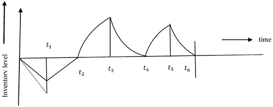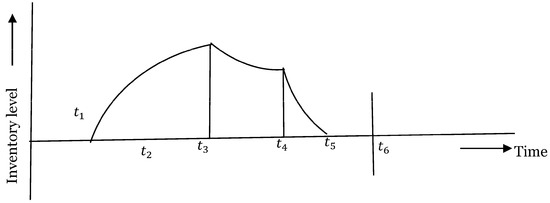 In this section, a cleaner production inventory model is developed under the effect of inflation. Waste management and reworking are considered in the model to reduce the waste from the system as much as possible. Because of the environmentally friendly nature of the decision maker, government regulation is imposed on carbon emissions. The inventory situation of the problem is described in Figure 3 and Figure 4. Figure 3 represents the inventory situation of serviceable items, while Figure 4 represents the inventory situation of non-serviceable items. From Figure 3, it is observed that the production process started at the time and over the interval [], backlogging was covered partially, and in the interval [], the inventory level increased due to production, demand, and deterioration. The production process stopped at the time , and in the interval [, the inventory level decreased due to demand and deterioration. Rework started at the time , and in the interval [], the inventory level increased due to rework, demand, and deterioration, and decreased in the interval due to demand and deterioration.