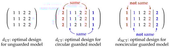 In this subsection, we briefly introduce optimal criteria for the unguarded model based on . The definitions are naturally extended to guarded designs by replacing with under the noncircular guarded model. A proper criterion on information matrices should satisfy (C.1) is concave, (C.2) for any permutation matrix S, and (C.3) is nondecreasing in the scalar . Following [38,39], we call universally optimal if it maximizes for all such . Note that the optimal design depends on through . Following [23,29,31,32], we adopt the Bayesian criterion
