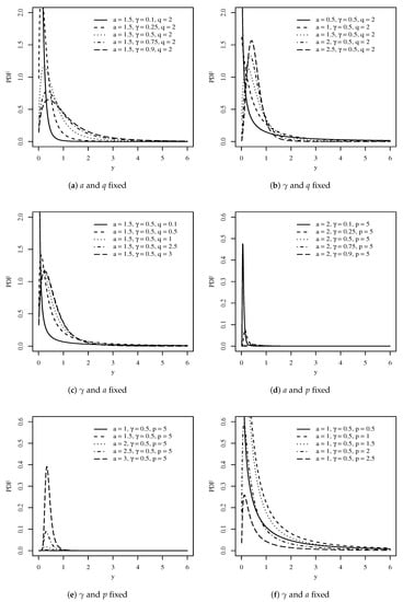 The PDF and CDF of a random variable Y following a Dagum distribution with shape () and scale () parameters, denoted by , are given by