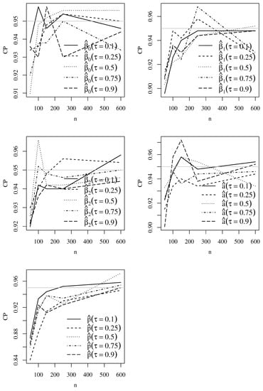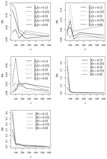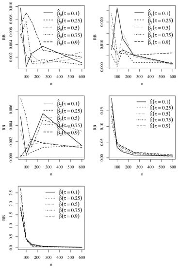 The Monte Carlo simulation experiments were performed using the R software; see www.r-project.org, accessed on 9 January 2023. The simulation scenario considers the following settings: sample sizes , 250, , regression coefficients , quantiles , for the Singh–Maddala model, and for the Dagum model, with 500 Monte Carlo replications for each sample size. Covariate values are obtained from a uniform distribution in the interval (0, 1). To study the ML estimators, we compute the relative bias (RB), root of the mean square error (RMSE), and coverage probability (CP). We expect that, as the sample size increases, the RB and RMSE reduce, and the CP approaches the 95% nominal level. The empirical RB, RMSE, and CP are computed from the Monte Carlo replications as