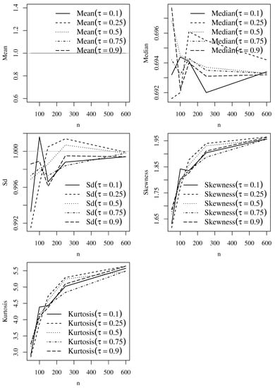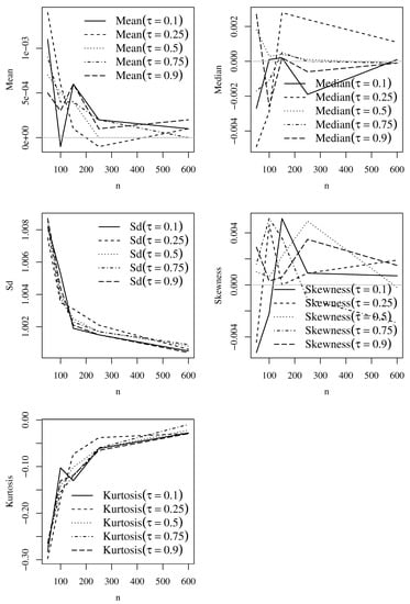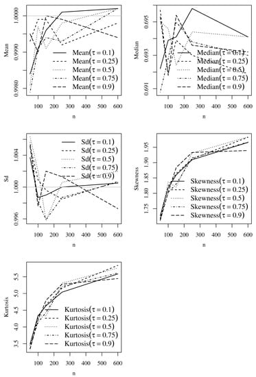 Next, we analyze the performance of GCS and RQ residuals with the sample mean, median, standard deviation (Sd), coefficient of skewness, and coefficient of kurtosis. Figure 8, Figure 9, Figure 10 and Figure 11 show empirical statistical indicators based on Monte Carlo simulations of the GCS and RQ residuals of the Singh–Maddala and Dagum models. The reference values of mean, median, Sd, skewness, and kurtosis are 1, 0.69, 1, 2, and 6, respectively, for the GCS residuals, and 0, 0, 1, 0, and 0, respectively, for the RQ residuals. From these figures, note that, as the sample size increases, the values tend to the expected results for each . Then, we will use both residuals to verify the fit of our models to income data.
