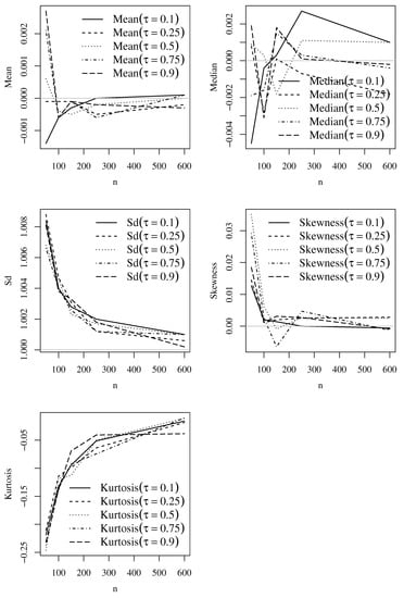 Plots of the listed statistical indicator based on Monte Carlo simulations of the RQ residuals for the Singh–Maddala model with , and the indicated value of . Source: data and own elaboration of the authors.