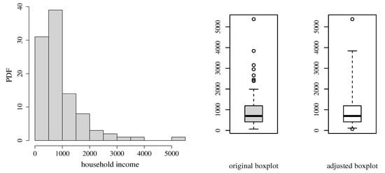Table 2 reports descriptive statistics for the household income. Figure 12 shows the histogram along with usual and adjusted box plots []. Note that these income data have unimodal and right-skewed behavior, which is the needed scenario to use asymmetric distributions. Figure 13 shows scatterplots (with correlation) between the income Y and the covariates , , and . We observe that correlations are reasonable and significant when testing , where is the correlation coefficient and r is the sample correlation. Meanwhile, the covariates have almost no linear correlation with each other.