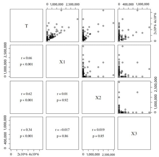 Scatterplots, sample Pearson correlations (r), and p-values of correlation tests between variables , and . Source: data and own elaboration of the authors.