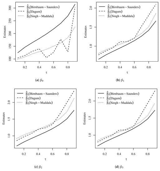 The estimated parameters of the Birnbaum–Saunders, Dagum, and Singh–Maddala models across are shown in Figure 14. From this figure, we observe that the estimates associated with all the covariates tend to increase as increases, as expected.