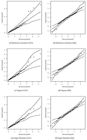The QQ plots with a simulated envelope of the GCS and RQ residuals for the models considered in Table 3 confirm the results presented in Table 3; see Figure 15. Similar results are obtained when considering .